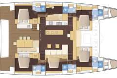 Charter Lagoon 620 Essense โDUOLIFEโ in Croatia, available from Split, Marina Kaลกtela or Dubrovnik. DUOLIFE has four queen size beds, all ensuite, luxurious, well-designed cabins with side access to beds. A black window frame, a black mast, a boom, an additional roof on the second deck and grey sideboards add unique character to this catamaran. Fully equipped with an attractive sun lounge on the upper deck for sunbathing in the sun or shade. The super-wide stern with two accompanying ladders and a hydraulic platform lets you enter, leave and jump into the water quickly and easily or perhaps just catch some sun close to the sea.Cabin arrangement of DUOLIFE?