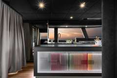 Let us welcome you onto the expansive aft-deck, indulge your senses in a champagne sunset, sipped from hand-cut crystal glasses. Let us treat you to our culinary creations, a bespoke menu specially designed for your tastes, complete with French titanium tableware. Tread through the spacious interiors, opulent and sleek in handcrafted and couture detailing: Burmese teak flooring, Carrara marbles, flush surfaces - all complimented by a stylish and soothing palate of dark blue and metallic grey tones. After a full day of heavenly explorings, indulge in a Lalique-fragrant bath and sink into our Missoni fabrics for a refreshing night in one of ‘E”s four en suite guest cabins… No compromises. No details left untouched. This is the place to spoil yourself.