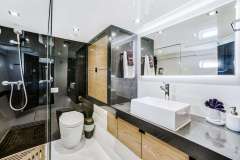 1 Master queen cabin with extra large bath including walk-in large shower, individual a/c control etc. 2 queen cabins each with individual a/c control, private ensuite electric head and stall shower.Ceiling heights: