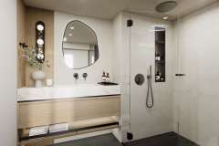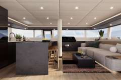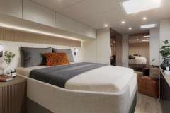 The flybridge is a standout, boasting plush lounge seating, a fully stocked wet bar, and plenty of space to soak up panoramic ocean views. The aft cockpit seamlessly extends from the open-plan salon, offering a sophisticated yet comfortable setting for dining or unwinding. Forward, a private bow terrace provides an idyllic escape, sheltered from the wind and perfect for sunset cocktails.
