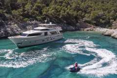 Offered by Amwax Prime, the astonishing charter yacht FLOR is a 91 ft yacht featuring a jetski. The promiment features of FLOR are her impeccable styling and inviting socializing areas. She was completed by the well-known ship builder San Lorenzo in 2013. An elegant refit was finalized in 2021. The expansive yacht layout features 4 cozy cabins and easily accommodates a group of 8 guests.