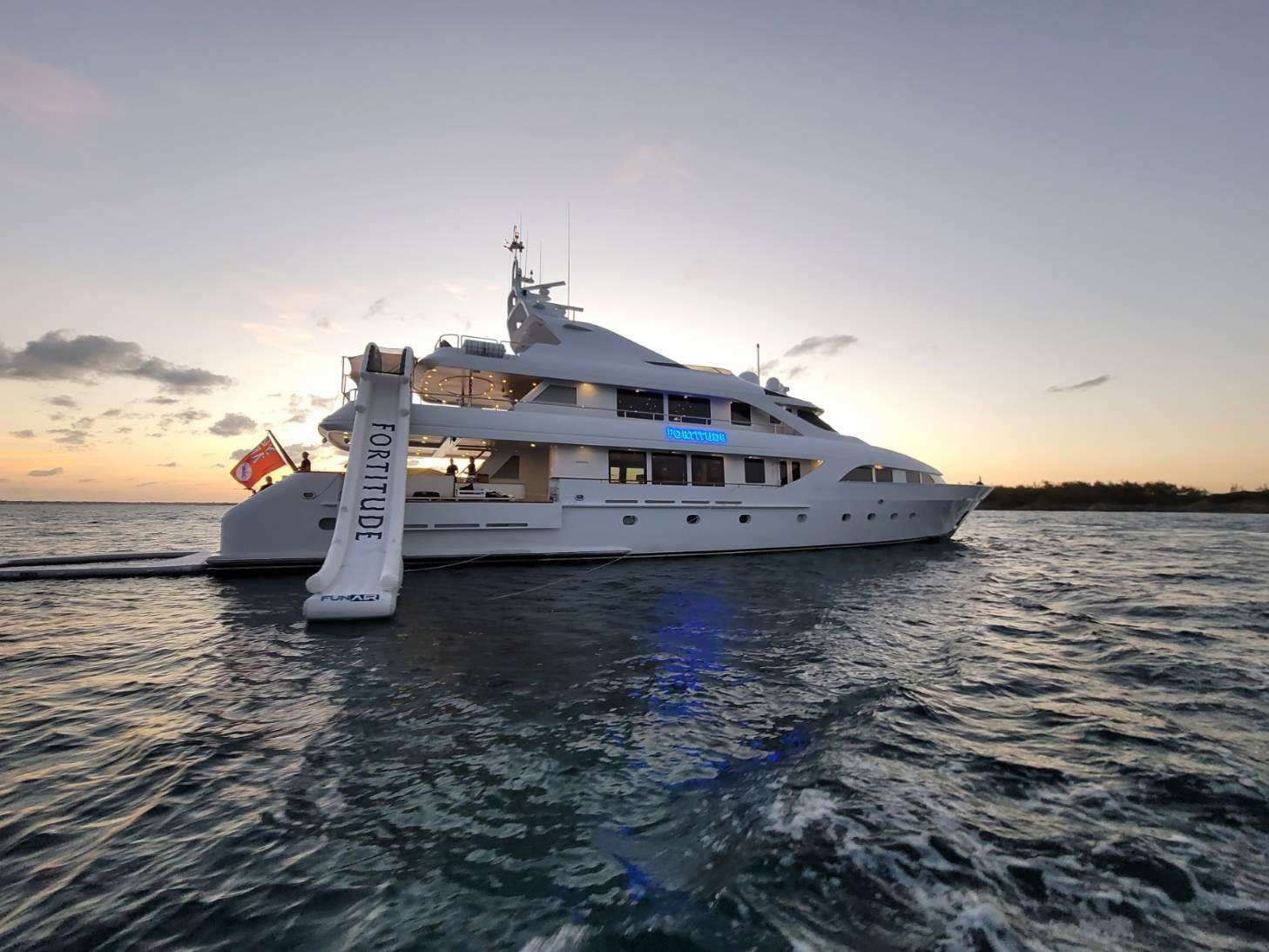 FORTITUDE is a large volume (28' Beam / 398GT) 136โ Tri-Deck M/Y. In 2019/20 FORTITUDE completed an extensive refit, totaling nearly $3 million, which included overhauling the generators, a W-6 service on the main engines, full paint job from the bottom of the keel to the top of the mast, updated electronics, A/V system, and interior soft goods renewal.This yacht has a well thought out designer interior that is not only spacious, with spectacular views from the main salon, formal dining area and sky lounge but also completely climate-controlled so guests can enjoy the passing vista in complete comfort. Her exterior areas also offer great views and plenty of relaxing and al fresco dining options.