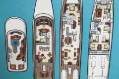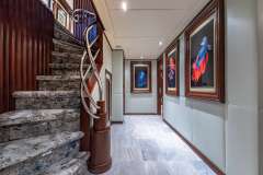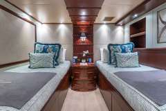 The remaining cabins are located on the lower deck accessed via a carpeted guest staircase that leads from the main deck to the grand guest lobby below. The four guest staterooms include a large VIP stateroom with queen size bed, 2additional queen staterooms, and a twin stateroom. Each guest stateroom features ample space and private bathsfinished in marble, custom wall coverings.