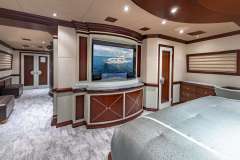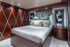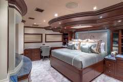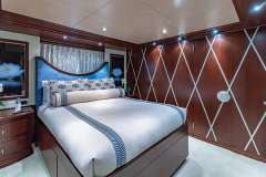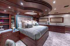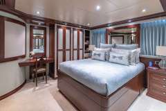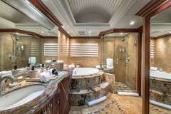 The private master stateroom located on the main deck features a luxurious king-size bed. The large, his and her bathfeatures marble, a large tub and central shower.