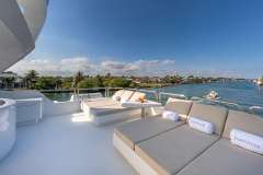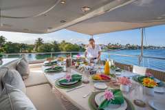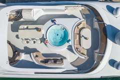 On the upper aft deck, aft of the sky lounge is an al fresco dining table, and there is also a large dining table and wet bar on the main aft deck. The aft deck also has stairs leading down to the swim platform.