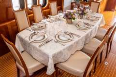 The delightful 23.55 m (77′ 3″) motor yacht GEKTOR ,originally built in 2004 by Princess has recently been refitted and can accommodate up to nine guests in four ensuite cabins for charters around Greece. Her flybridge design creates wonderful space for guests to spread out across a choice of sheltered or open zones, perfect for dining or sunbathing. Bench seating and sun pads are cushioned for ultimate comfort and a water’s edge swim platform creates the perfect launch pad for guests to enjoy the great selection of water toys. The refit has updated the classic interior, retaining the original gloss wood paneling but improving the décor and soft furnishings.