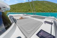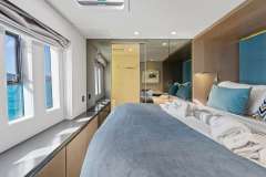 A generous saloon combined with a functional galley opens both onto the bow terrace and cockpit creating one huge lounging area. Decorated with bright powder blue accents, the saloon is equipped with a big unfoldable table and comfortable seating for 10, allowing guests to dine in comfort and relax in a homelike atmosphere.