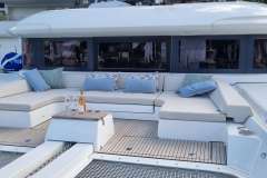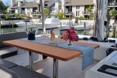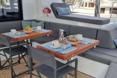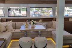 Stepping aboard, you’ll instantly be greeted with an expansive dining area in the aft. With plentiful seating areas, a large group can enjoy time in the sun, outdoors in the shade, or comfort under air conditioning.