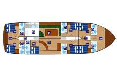 15/03 - 31/06 € 15.311 31/05 - 19/07 € 17.995 19/07 - 09/08 € 20.679 09/08 - 23/08 € 24.400 23/08 - 30/08 € 20.679 30/08 - 13/09 € 17.955 13/09 - 18/10 € 15.311 Price in € per week VAT included The price includes: VAT, boat rental for exclusive use,4 crew members (captain, sailor, cook, steward), welcome cocktail, daily cleaning, linens, towels, bath towels, fuel for max 4 hours navigation per day, fuel for generator 4 hours per day, last night moorings, use of onboard equipment, Wi-Fi Not included: soft drinks, alcoholic, moorings and port taxes if due, 2 dinner in full board Extras: half board compulsory € 390 per person per week - mineral water included with meals full board except 2 dinners € 490 per person per week - mineral water included with meals 50% less for 3/10 years old children - free 0/2 years old childrenCabin arrangement of HANDE CAPO GALERA?