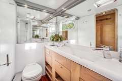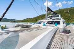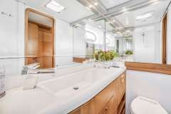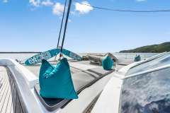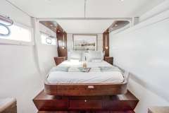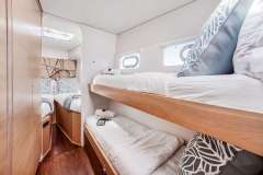 Designed to serve as an idyllic floating abode for family and friends, the Open Ocean 750 yacht HQ2 offers a blend of sumptuousness, comfort, and adaptability. Accommodation is thoughtfully provided with two main cabins, located in the aft of each hull, both featuring generous space and an elegant en-suite bathroom with a shower.Additionally, on the port side, a guest suite in the forward cabin, also en suite with bathroom and shower, ensures a similarly luxurious experience. On the starboard hull, there is another suite containing a v-berth that can be transformed into a spacious double bed, complemented by additional upper and lower single berths, sleeping 4 in total. This cabin too, is en suite with bathroom and shower. There is even a day head for the convenience of guests and crew.