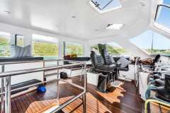 The crew is accommodated in the crew cabin up front on the port hull, designed to accommodate a professional crew of two as well as the enclosed helm, where the captain sleeps alongside his instruments.