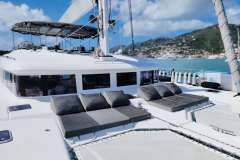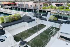 The exterior of Huntress is equally impressive. You can relax on the perfectly configured deck spaces that are equipped with areas for socializing without sacrificing privacy. There is no better way to revel under the Caribbean sun. The covered flybridge is home to a huge comfortable and sleek sofa and additional bench seat. It is the perfect space to enjoy the beautiful views, gorgeous sunsets, and witness the amazing milky way while at anchor. The comfort and views of the flybridge make it the best place to be, while underway, for dancing the night away and enjoying sunrise yoga.