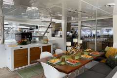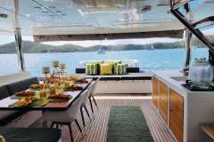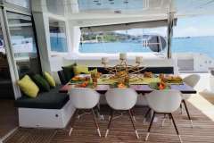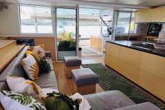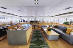 The design of the 620 has been perfected for socializing with seemingly endless space both above and below deck. This yacht shows why it is the gold standard as the setting for the perfect guest experience. With multiple dining, living, sunbathing, and lounge areas to choose from, you will always have the space to sneak away for some shade or to read a book.... or you can choose to get as involved as you desire. As a larger catamaran, you can count on greater comfort while at sea, and a second-to-none sailing performance during navigations. The salon is extremely spacious, thanks to well thought out style and intelligent design with large windows ensuring all are able to enjoy the beautiful scenery from the salon in 360 degrees. It features a U-shaped sofa and coffee table for lounging.