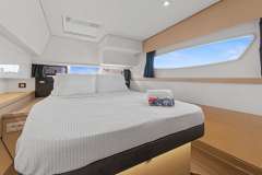 Natural light floods the interior through roof and panoramic windows in the saloon, a wide window door leading to the cockpit, and large windows in all cabins. The interior decor exudes coziness, with soft hues and an elegant style that invites relaxation.