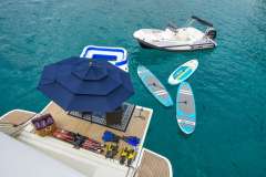 Built in 2006 and a 2022 refit, Indulge II is the ideal luxury yacht for kicking back and relaxing whilst on charter, showcasing clever use of space with an artful combination of integrated systems and luxurious features, she's a crowd-pleaser for sure. She offers guest accommodation for up to 10 guests with a layout comprising a master suite, one VIP cabin and two twin cabins. When chartering with 10 guests, 2 of the guests must be children under the age of 12. She is also capable of carrying up to 4 crew onboard to ensure a relaxed luxury yacht charter experience. Set against the backdrop of your chosen cruising ground, you and your guests can enjoy fun on the water with the collection of water toys and accessories aboard Indulge II. Guests can feel the wind in their hair and jump the waves on one of the two Sea Doo WaveRunners and a plethora of water toys. If that isn't enough, Indulge II also features a top deck hot tub. A large bow-pad with bimini top will protect yourself while enjoying your front row seating while island hopping. When it's time to travel from land to see, it couldn't be easier with a 20ft Zormenti 170hp Tender. It can easily pull skiers, wakeboards and more, plus it seats 10 for optimal guest comfort. Once onshore, she has 2 electric bikes that can be used by guests. Indulge II is a unique motor yacht and the ideal platform for an adventure charter that will guarantee unforgettable memories.