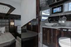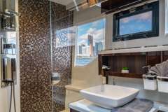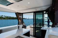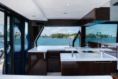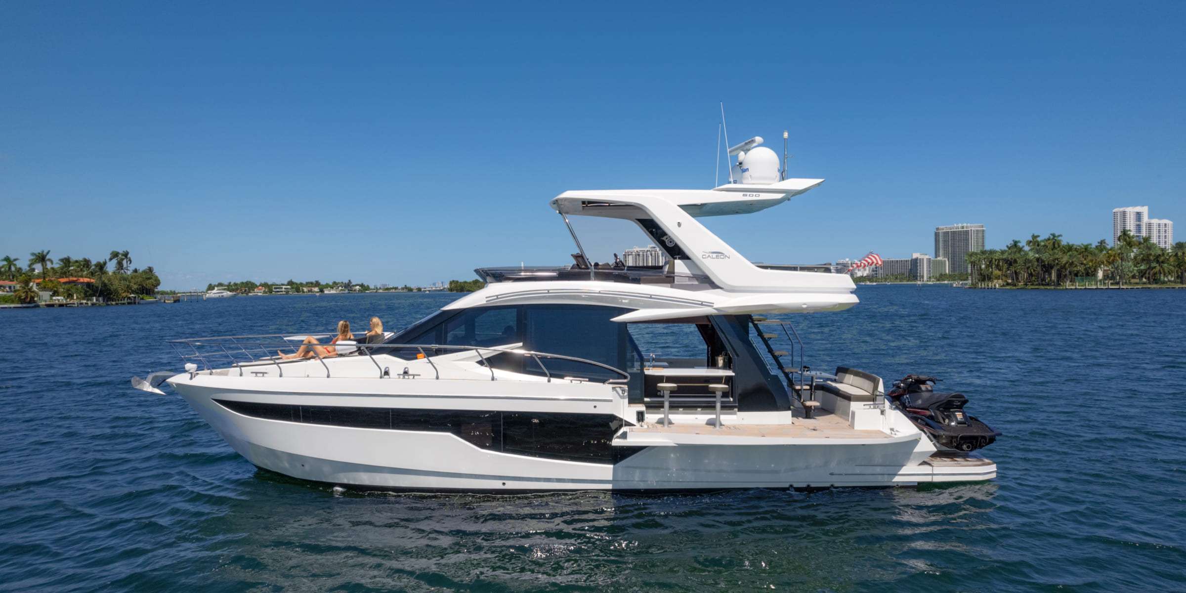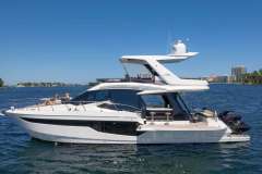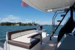 The Galeon 500 FLY is an amazing yacht. She has a beautiful Hi-Lo platform for dingy’s, jet skis, scuba diving, and more. The most unique feature of the Galeon is her balcony on the aft starboard and port side. It can be used as a standing bar and a sofa from the salon can turn into outdoor seating for 2.She also features a beautiful lounge area with a foldable table. Her flybridge features a large sectional sofa and a wet bar. You can easily soak up the sun in Miami during your luxury yacht charter and create lasting memories with family and friends.