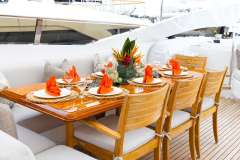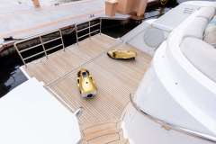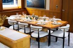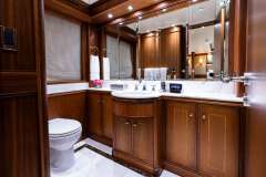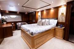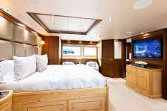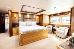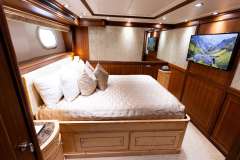 The main deck master stateroom utilizes space efficiently, featuring a king-sized bed, generous his and hers cedar wood closets, a sofa, a writing desk, and an en suite bathroom.The VIP stateroom, or second master, is located below deck and offers similar levels of comfort with a full beam configuration.