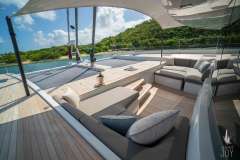 The forward cockpit includes informal lounge seating, perfect for sheltered relaxation, and provides direct access on to the trampoline net for relaxing and sunbathing. Moving upwards, the flybridge with hardtop – ideal for protection from the heat of the day – is yet another beautiful space with a navigation station, sunpads, seating and unspoiled views across the water.