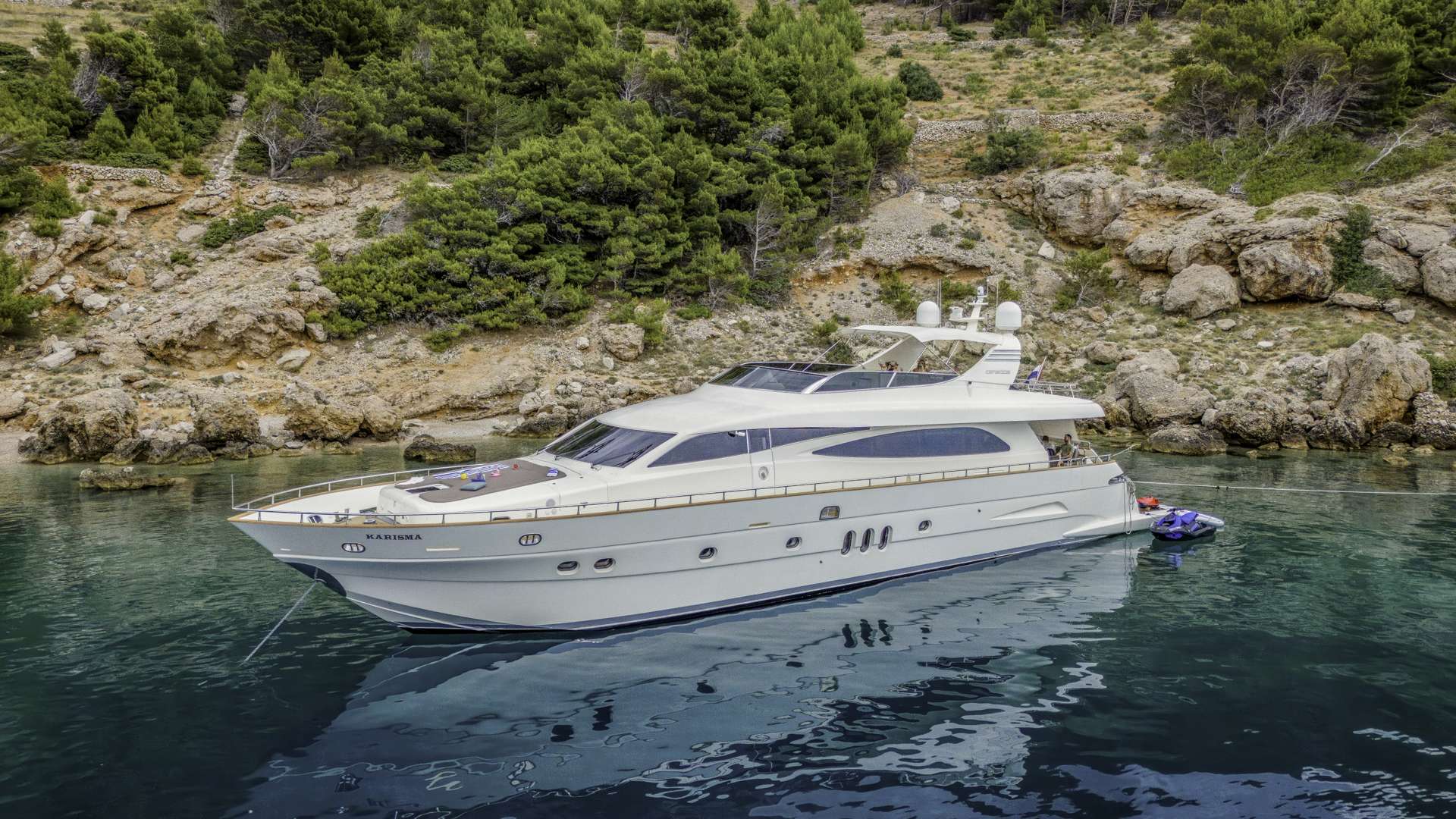 Introduced by Amwax Prime, the impressive charter yacht KARISMA is a 86 ft yacht featuring a jetski. The main attractions of KARISMA are her generous space and alfresco dining areas. She was delivered by the well-known ship builder Canados in 2008. A comprehensive refit was completed in 2023. The ingenious yacht layout features 4 large cabins and comfortably accommodates a maximum of 8 guests.
