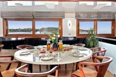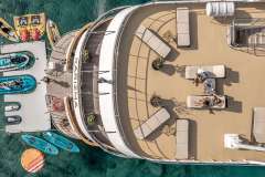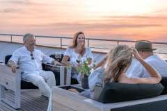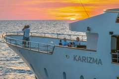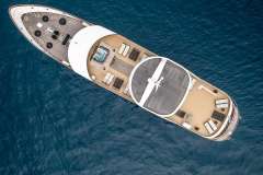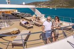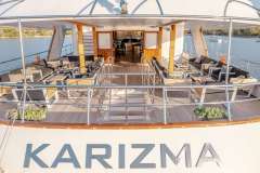 Yacht Karizma features 4 large decks where everybody can lounge comfortably. With endless sunchairs and a jacuzzi, the sundeck is definitely the favorite space for entertaining and relaxing. In case you want to shield yourself from the warm summer sun, the shaded area with cushioned chairs and coffee tables is the perfect spot to enjoy a refreshing drink.