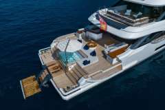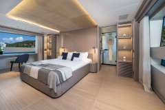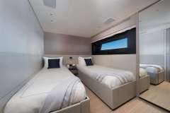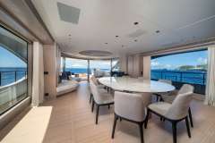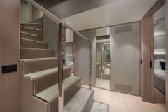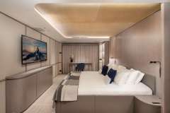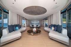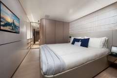 Upon entering the salon, guests can be received in a semi-al fresco way with the crescent aft doors fully open or at the push of a button continue into the main salon and dining. The choice of seamless in and out ambience is in part what makes this deck feel as if guests are on a much larger yacht. The on-deck Master with oversized windows brings the outdoors in. A port side vanity/ working desk is versatile for his or her use as needed while the Primary bath has central double sinks, private toilet and large glass enclosed shower. Plenty of hanging and cabinetry storage as needed.