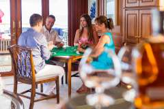 SKYLOUNGE on BRIDGE DECK: Sofa with coffee table, plus a game table. Bar area. Entertainment center with 50' retractable plasma TV/DVD/CD with individual satellite receiver, surround sound, and iPod docking station.