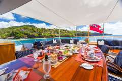 BRIDGE DECK AFT: Magnificent oversized deck with generous seating for al fresco dining. Optional umbrellas provide ample shade.