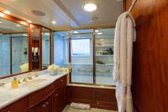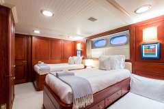 ON DECK MASTER STATEROOM: Forward. Upon entering, there is an office to starboard and a small drinks refrigerator. The master stateroom is full beam with walk-around king size bed, sofa, and vanity. There are two separate entrances to the en-suite his-and-hers bathroom with twin sinks. His with stall shower, hers with Jacuzzi tub. Private head. Entertainment system featuring 27' flat screen TV/DVD/CD with individual satellite receiver, and iPod docking station. Large windows create abundant natural light in the Master Stateroom if desired.BELOW DECKS GUEST STATEROOMS: