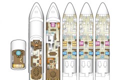 FORWARD TO PORT: Spacious stateroom with twin beds and one trundle*, with the option to convert the twins to a walkaround king bed. Entertainment system features 20' flat screen TV/DVD/CD. En-suite features a tub with shower overhead, sink and head.