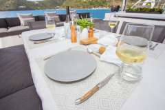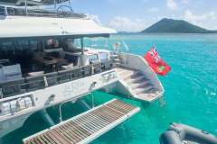 The three spacious air-conditioned staterooms are fitted with high end materials and furniture that allow for a nearly unprecedented level of comfort. Guests can enjoy their gourmet meals in our luxurious cockpit seating area and then lounge with a cocktail on the massive sun-deck afterwards. The gull-wing bridge deck design allows for greater comfort and smoother sailing, despite heavy seas.