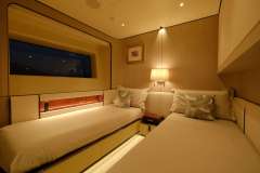 A full width owner's cabin with private balcony, 2 VIP cabins and 2 twin guests cabins converting to double bed with additional pullman bunk.