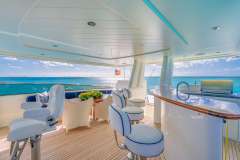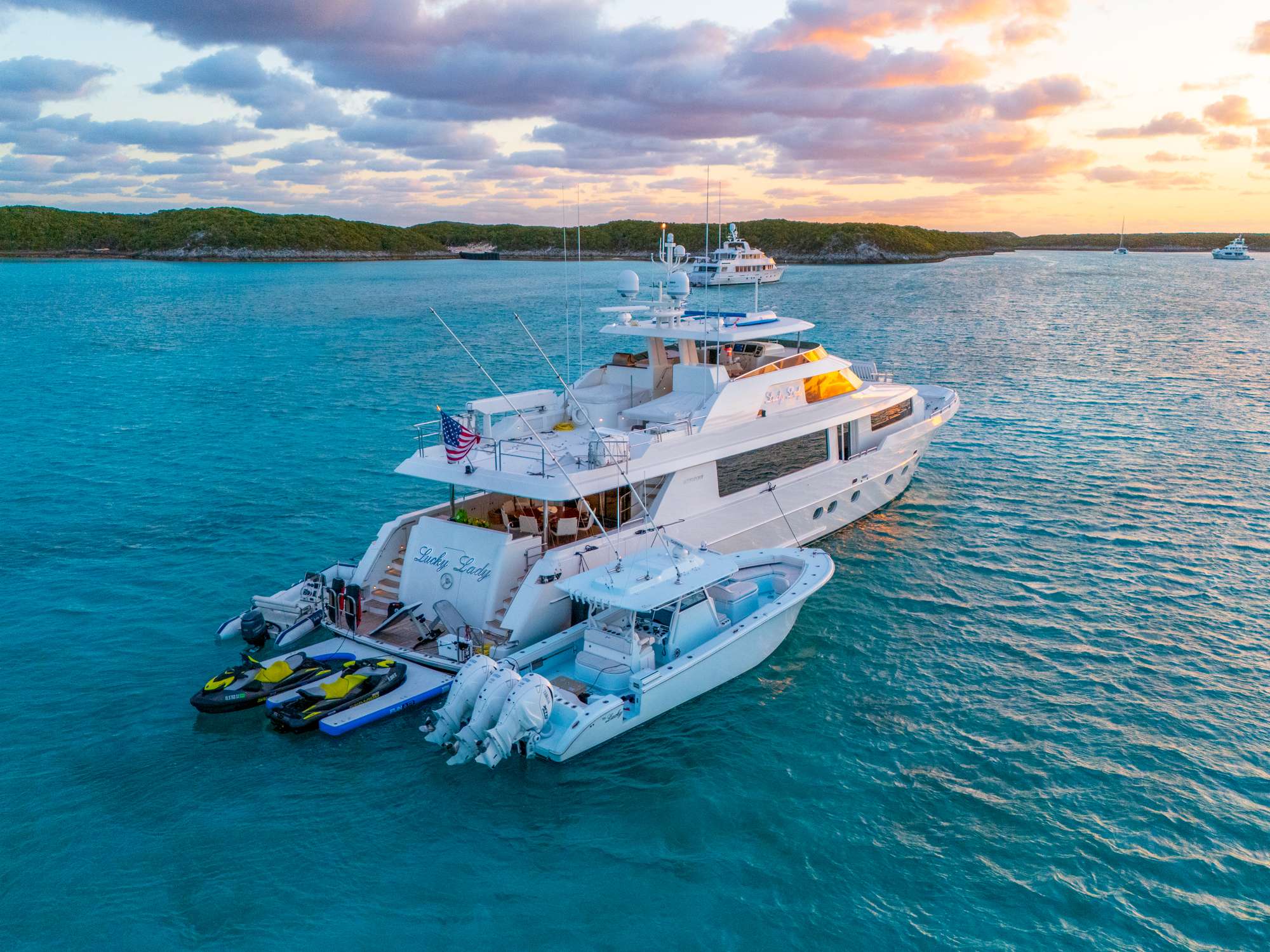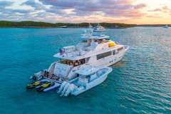LUCKY LADY is truly the most customized 112’ ever built. She offers both quality and a unique design throughout, including the complements of beautiful light fabrics and rich mahogany woods, a one-of-a-kind custom “Chef’s Galley,” a twin forward cabin, and the only 112’ with a day head and shower on the flybridge. This program also boasts a large toy selection for fun under the water and on top!