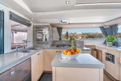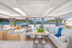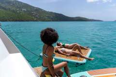 The Fountaine Pajot Saona 47 maximizes living and entertaining space. The aft lounge area is expansive, making it the social center of the boat; providing seating, standing and reclining space for a multitude of guests. For those that seek the sun, the lounging area at the front of the yacht provides a cushioned space for sunbathing where the view is unobstructed.