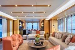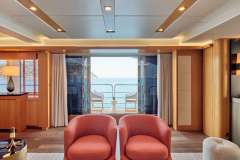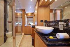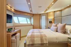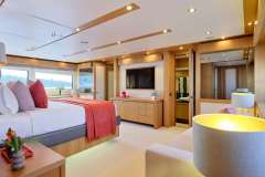Master Cabin on Main Deck with with king size bed dual-entry en-suite facilities in marble. Two sinks, shower and walk-in closet in bathroom. Second Walk-in closet, safe, desk, sofa and TV in cabin.