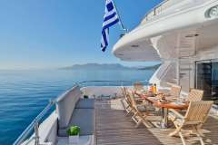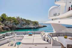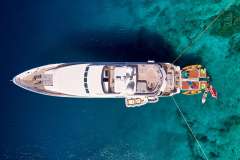 Combine the Greek island hopping experience with the culinary philosophy of Costas Spiliadis, renowned chef of Milos restaurants. Milos at Sea offers abundance of space for 10 guests who can expect to be serviced perfectly and efficiently by a professional, year-round crew of 7. Bright and comfortable interiors with panoramic view of the sea are featured on the main deck's salon and Master suite. Below deck is the full beam VIP stateroom and two very spacious Twin cabins all with ensuites. Her multi-functional sundeck is perfect for entertaining guests and includes comfortable sofas, separate sun mattresses and a dining area which is adjoining to the open kitchen barbeque area. A wide variety of water toys and sonos system add to an already full list of amenities.
