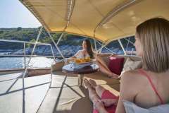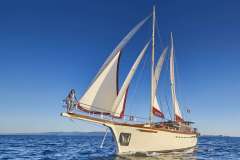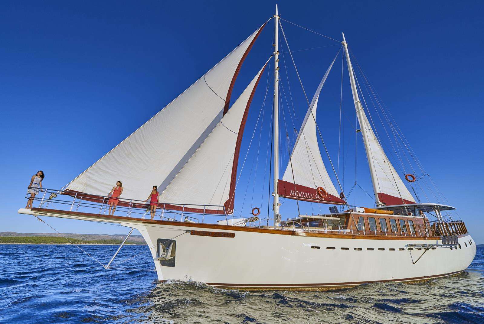 Luxury Gulet Morning Star is a shining star in our gulet offer. First impression when you look at this gulet would be at least amazing as it is about vintage looking sailing yacht with elegant lines and curves, inviting deck and a touch of glamour. She has been built in 2008 but has been fully maintained and refurbished year after year. So, we are talking about a youngster with vintage look. Morning Star is equipped with 6 cabins (2 double cabins, 2 twin cabins, 2 triple cabins). Combination of American cherry wood and bright colors make warm and welcoming atmosphere. Pleasant relaxing dreams are ensured by the fact that every cabin has their own independent air conditioning system. Daytime is to be spent either swimming and snorkeling, sipping refreshing cocktail in the shade in aft cushion area, or sunbathing on the cushions in the front. Special shaded cushioned area at front allows you to fully enjoy the stunning view and wind in your hair while sailing. Namely, Morning Star is one of the few gulets that has full sailing equipment and very good sailing performances. The dining area holds the central and the most important position on the deck because special care aboard the Morning Star is given to the gastronomy. Evening chats, or time to dine can also be spent in spacious saloon which abounds with natural illumination thanks to huge window area that surrounds the saloon. Last but not least, the inevitable part of the story about this yacht is the crew. They are here to make your sailing trip as comfortable, enjoyable and fun as possible, Always kind and smiling they will for sure try their best to make your wishes a reality. This is why Morning Star is boat with most returning guests and best feedback.