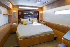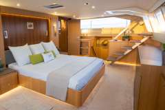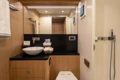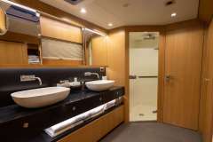 NDS EVOLUTION can accommodate up to 9 guests in four beautifully appointed staterooms below, each designed with guests’ comfort in mind. The full beam Master stateroom with its panoramic view features an office desk and serene corner lounging area as well as private access to the forward deck. The guest staterooms consist of two Doubles and one Triple stateroom, making the yacht an excellent option for families with kids.