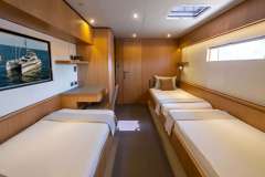 She can accommodate up to 9 guests sleeping on board. The full beam Master Stateroom with its panoramic view includes a private access to the forward deck, with a serene corner lounging area. Also included is a 3 single bed stateroom, perfect for the kids, and 2 more double bed VIP staterooms. All staterooms have ensuite bathroom. The forward part is dedicated to the crew with the captainโs cabin, a twin cabin, a large galley with crew mess.Cabin arrangement of NDS EVOLUTION?