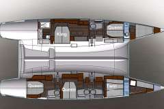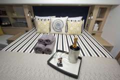 Accommodation for 10 guests in 5 cabins which are all en-suite: 1 King, 3 Queens, and 1 Twin which can be configured to a King upon request. Each cabin has independent A/C, Sony and Apple flatscreen LED TV with access to onboard server film library with over 500 films, Bose hifi music system, high quality bed linens and and towel sets including nice thick NENNE-branded beach towels. The very large primary cabin has a desk/dressing table and a comfortable couch.