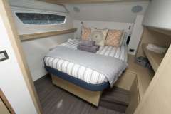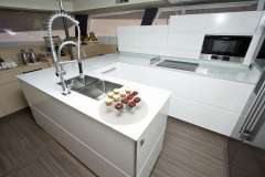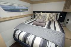 Step into the saloon which features urban chic decor with gorgeous leather upholstery, and lots of space for comfortable entertaining in air-conditioned comfort if so desired. The large relaxing seating area has an electric rise and fall coffee / dining table providing an additional option. The open galley is equipped with state of the art appliances, fine china, and extensive glassware. There is an extra chart plotter and helm station at the chart table from where the boat can be steered.