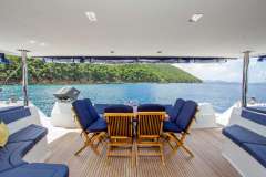 The large aft deck is shaded by the flybridge overhead and provides additional comfortable lounging spaces, as well as an elegant setting for formal dining. Two large sumptuous pads are optimal for relaxing. A projector and large cinema screen can be viewed inside from the cockpit or saloon.