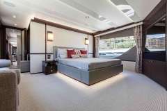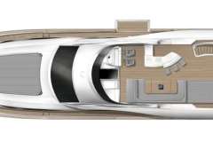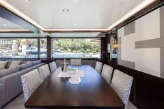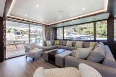 Stepping onto the aft deck, you are first greeted by an al fresco dining area that comfortably seats up to 10 guests. Forward, guests can enjoy the use of a large double sunbed, which has steps down into an additional dining area. This spot is perfect for a little extra privacy when dining outside in port. A side balcony unique to the 95 model can also be accessed and enjoyed via the main saloon, bringing guests closer to the ocean. The exterior deck areas also feature a fabulous Sonos sound system with Sonance Extreme speakers, adding atmosphere to any party or occasion.