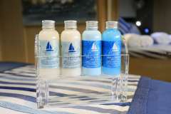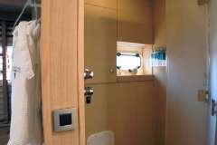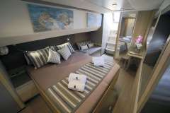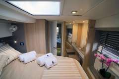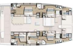 One full Master Stateroom, One VIP cabin, Two Queen cabins and One Twin cabin.All with private facilities and separate plexiglass showers. Master has a separate Jacuzzi Hydromassage Shower.