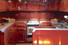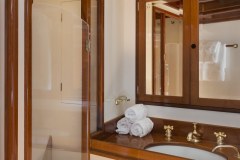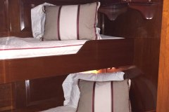 Also aft of the master on the port side is a common head with shower (shared by crew). On the starboard side are two well-appointed guest cabins (one of which are used by the crew), each with over and under single berths, a bureau and hanging locker. These two cabins share the common head and hand-shower.