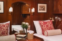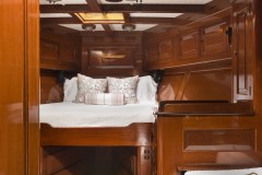 A center hallway runs aft to the salon. Aft and to port of the master stateroom is an elegant VIP Suite that was originally planned for the King and Queen of Norway who frequented the yacht. This cabin is an intimate oasis featuring his and her twins, ample storage and a private head with a stall shower.