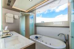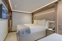 In addition to the master suite, the yacht features a VIP stateroom with a queen-size bed, a guest stateroom with another queen-size bed, and two staterooms with convertible twin-size beds, perfect for families with children. The yacht's modern interior styling and ambient lighting add a touch of elegance to each guest room.