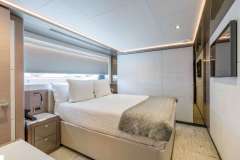 The master suite on the charter yacht O is a peaceful haven, featuring a king-size bed, a lounging area, and a vanity. The suite's large windows allow natural light to flood the cozy interior, creating a serene atmosphere. The en-suite bathroom features his-and-hers sinks, a tub, and a shower.