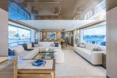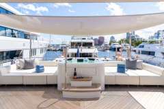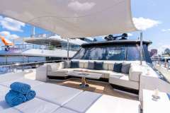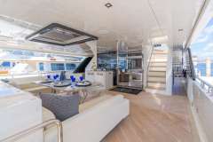 The outdoor spaces are equally impressive, with a large aft deck that is perfect for cocktails, meals, games, or lounging. The flybridge is a hub for alfresco entertainment and dining, complete with a jacuzzi and unobstructed views. The foredeck is spacious, with ample seating options and comfortable sun pads.