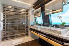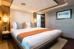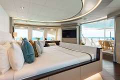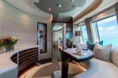 Panoramic views can be enjoyed from the vast luxurious master suite, now with a completely new bed, touch controlled curtains and adjoining private observation lounge. Aside from the king size bed facing aft, the stateroom features an oversized walk-in wardrobe, marble bathroom with double sinks and steam shower featuring a stunningly intricate timber wall art piece and custom lighting. A stew pantry is positioned just outside of the observation lounge amdship and convenient for serving the next level up to the sundeck.