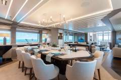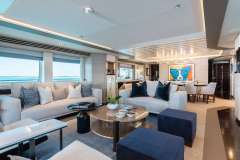 The main salon offers a comfortable seating area positioned centrally which leads seamlessly to the formal dining; slightly lighter in color scheme with all new furnishings and leather panels. New touch control blinds throughout.